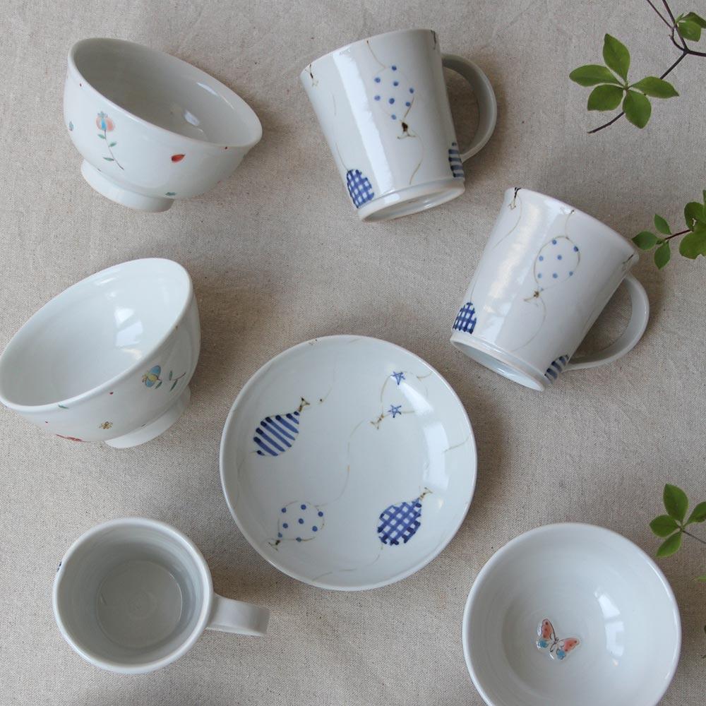 今回は、バルーンの小皿とマグカップ、花と蝶の飯碗が届いています。
