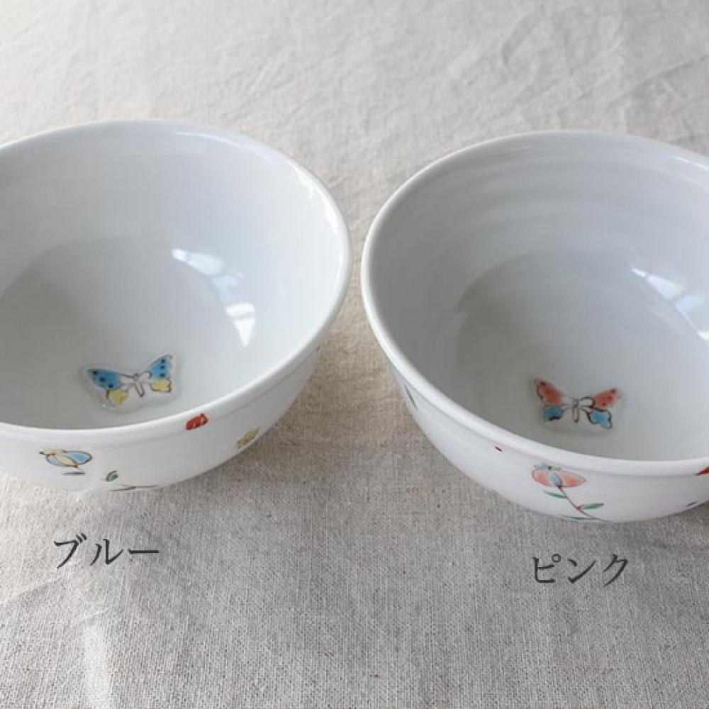 飯碗の表には花が描かれ、底の部分には蝶が少し浮き上がった絵付けになっています。