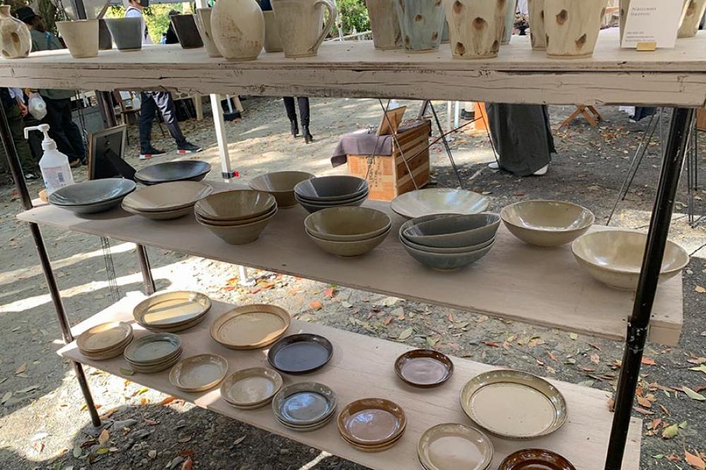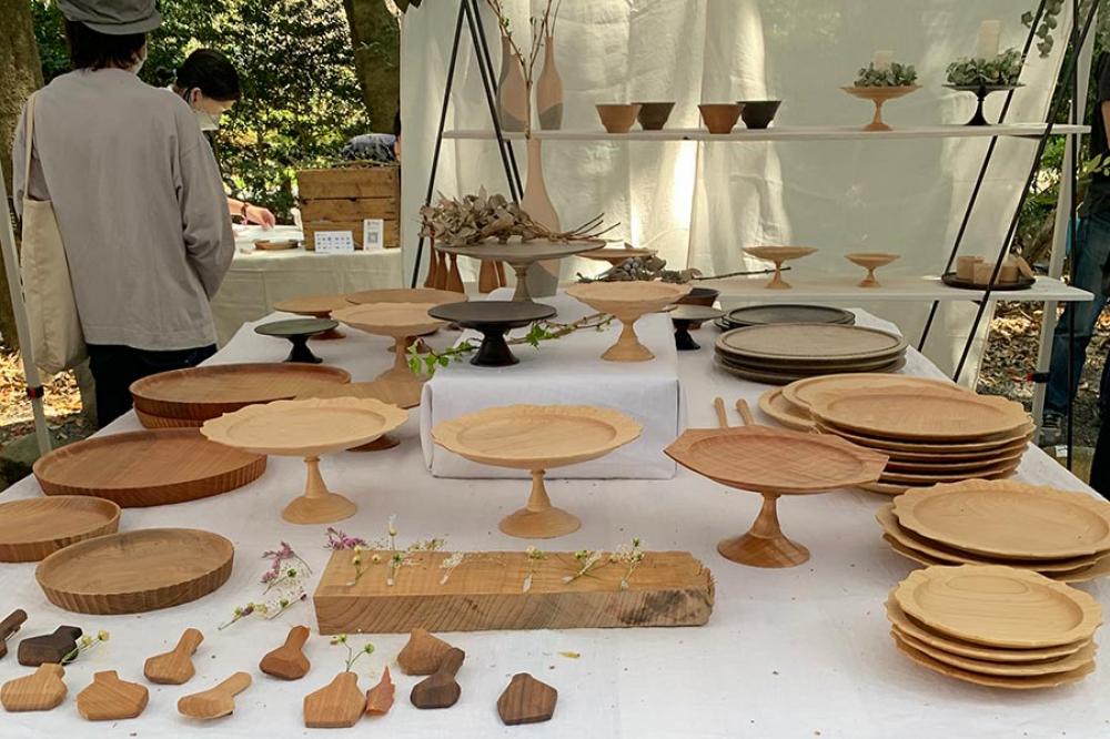 大きな鳥居を過ぎると、参道の左右に器や木工、ガラスの作家さん達のテントが並びます。