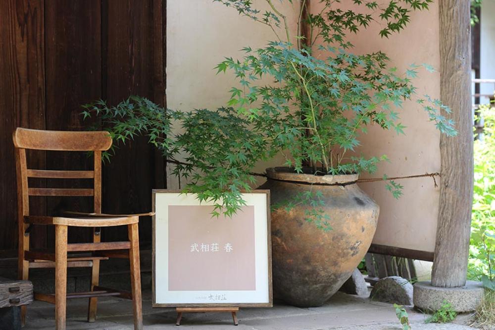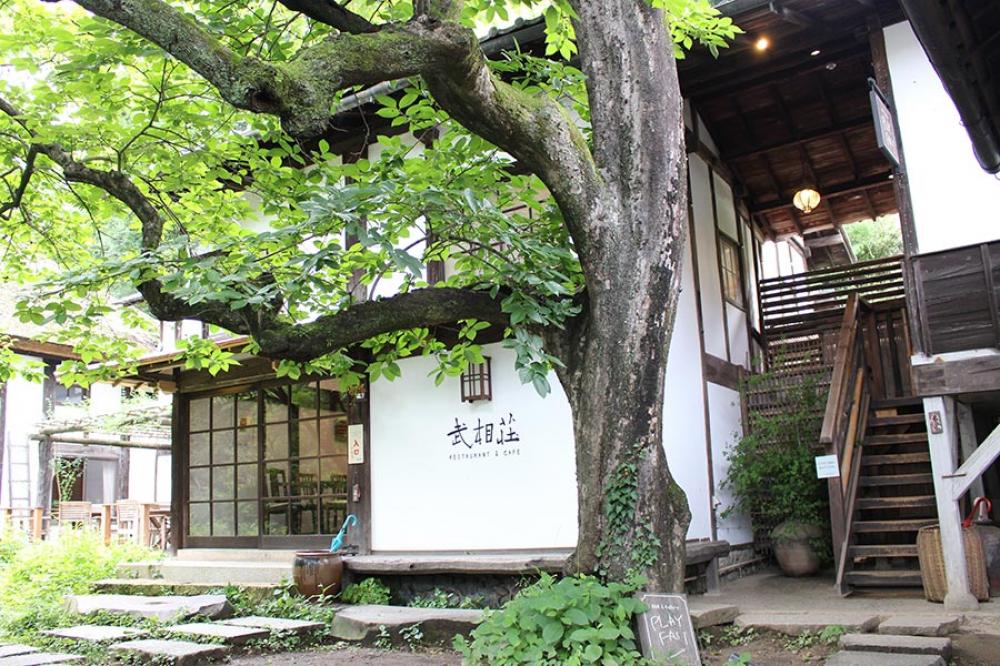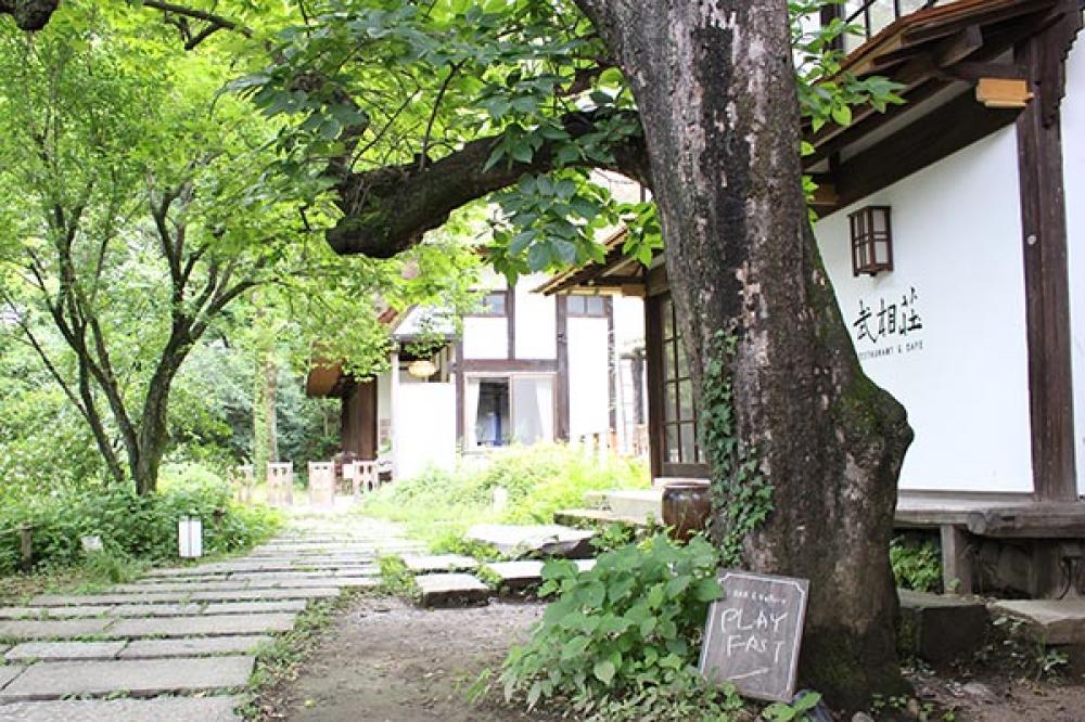 白壁に「武相荘」と記された建物が、レストラン&カフェ。