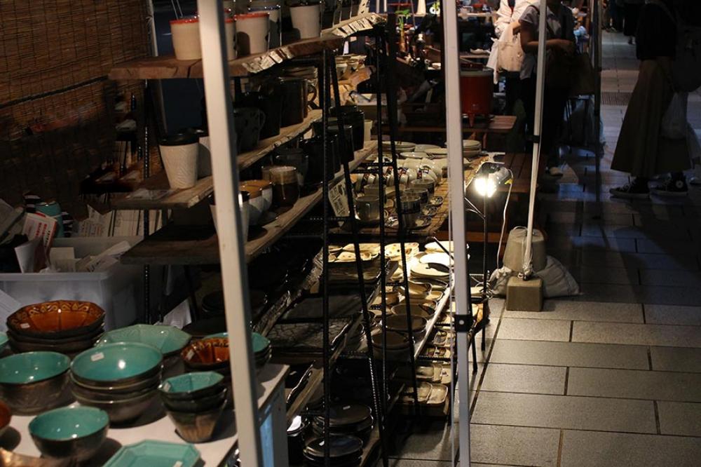 夜の陶器市は暑さを避け、お祭り気分でいいのですが、電球で器の色がわかりにくいところがあります。