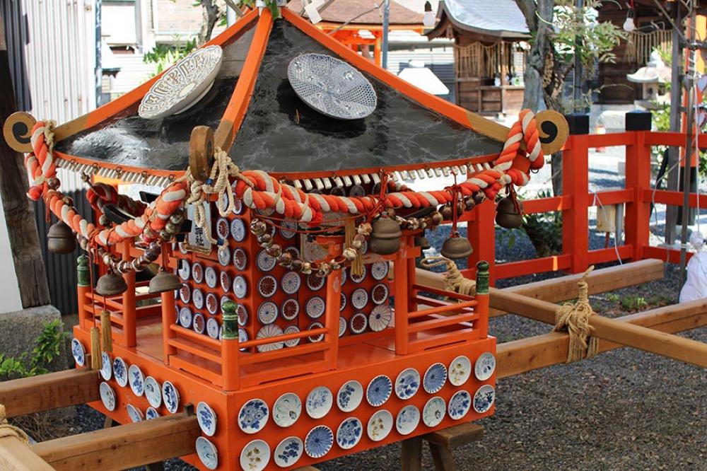 豆皿、小皿、大皿など陶器があしらわれたお神輿です。